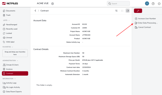 The responsible administrator and other authorised administrators can access contract information under “Administration > Contract“. The following self service functions are available: