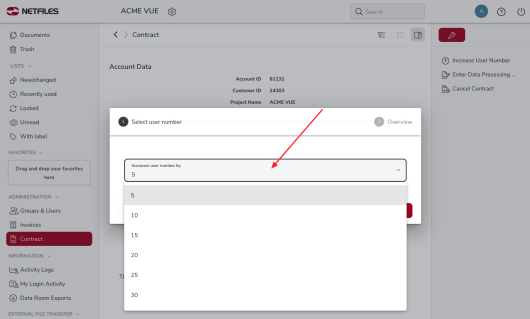 To increase the number of users, select the required number of additional users in the “Increase User Number” dialogue and click “Next”.