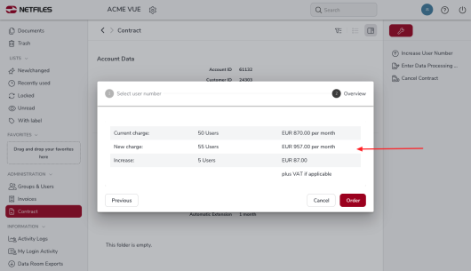 You are then shown a summary of the changes and associated costs. To add the additional users, select “Order“.