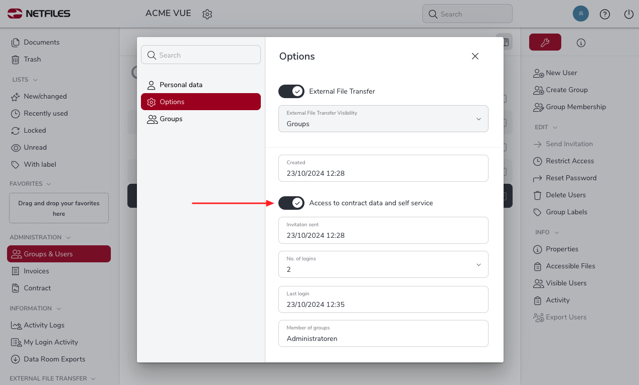 The responsible administrator can authorise other administrators to access the contract and use the self service functions. Open “Groups and Users > Administrators” and call up the personal profile of the administrator in question. To do so, either click onto their name or select the user in the listing and open “Properties” in the right menu. On the “Options” tab, activate “Access to contract data and self service“.