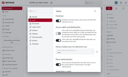 Here you will find the options for creating users and their rights. The options set here apply to all users in the data room.