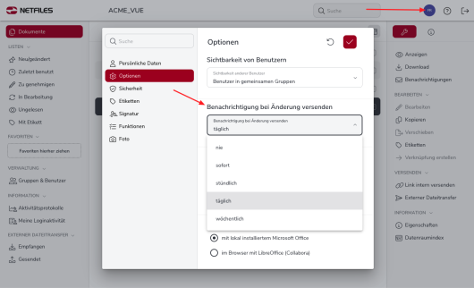 Dieses Intervall ist eine Benutzereinstellung, die Sie individuell im Datenraum ändern können. Klicken Sie hierzu rechts oben auf Ihren Benutzernamen. In dem aufgeklappten Menü wählen Sie “Optionen”.