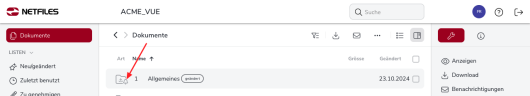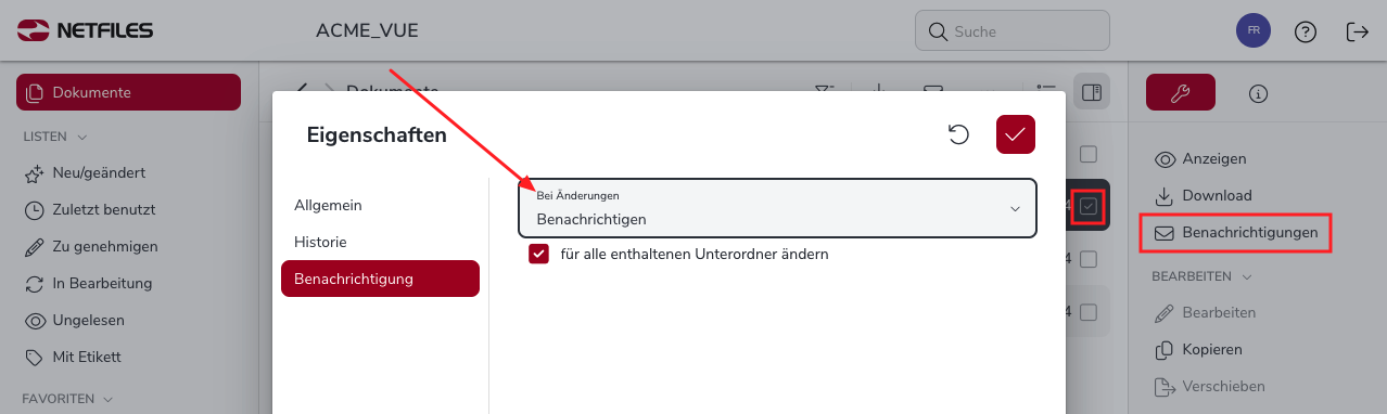 Um die automatische Benachrichtigung (Benachrichtigung bei Änderungen) für einen bestimmten Ordner zu aktivieren, wählen Sie den entsprechenden Ordner aus und klicken anschließend auf die Funktion „Benachrichtigungen“ in der rechten Funktionsleiste.