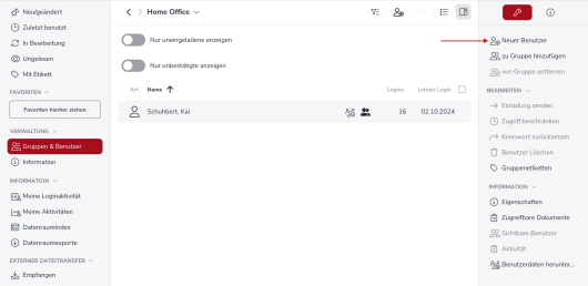 Nachdem Sie im ersten Schritt Gruppen gebildet haben, können Sie nun Benutzer anlegen. Klicken Sie auf die entsprechende Gruppe und wählen Sie die Funktion “Neuer Benutzer” in der rechten Funktionsleiste.