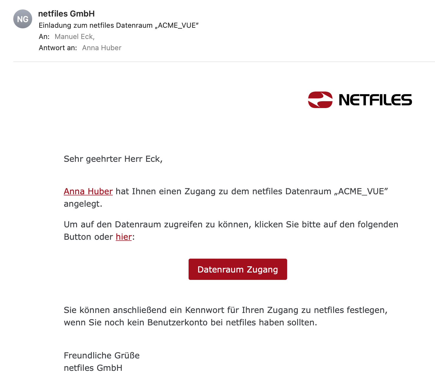 Nach Bestätigung des Dialogs erhält der neue Benutzer automatisch eine E-Mail zur Aktivierung seines netfiles Zugangs. Dieser Link ist 14 Tage lang gültig, sofern das Benutzerkonto nicht vorher manuell gelöscht wird.