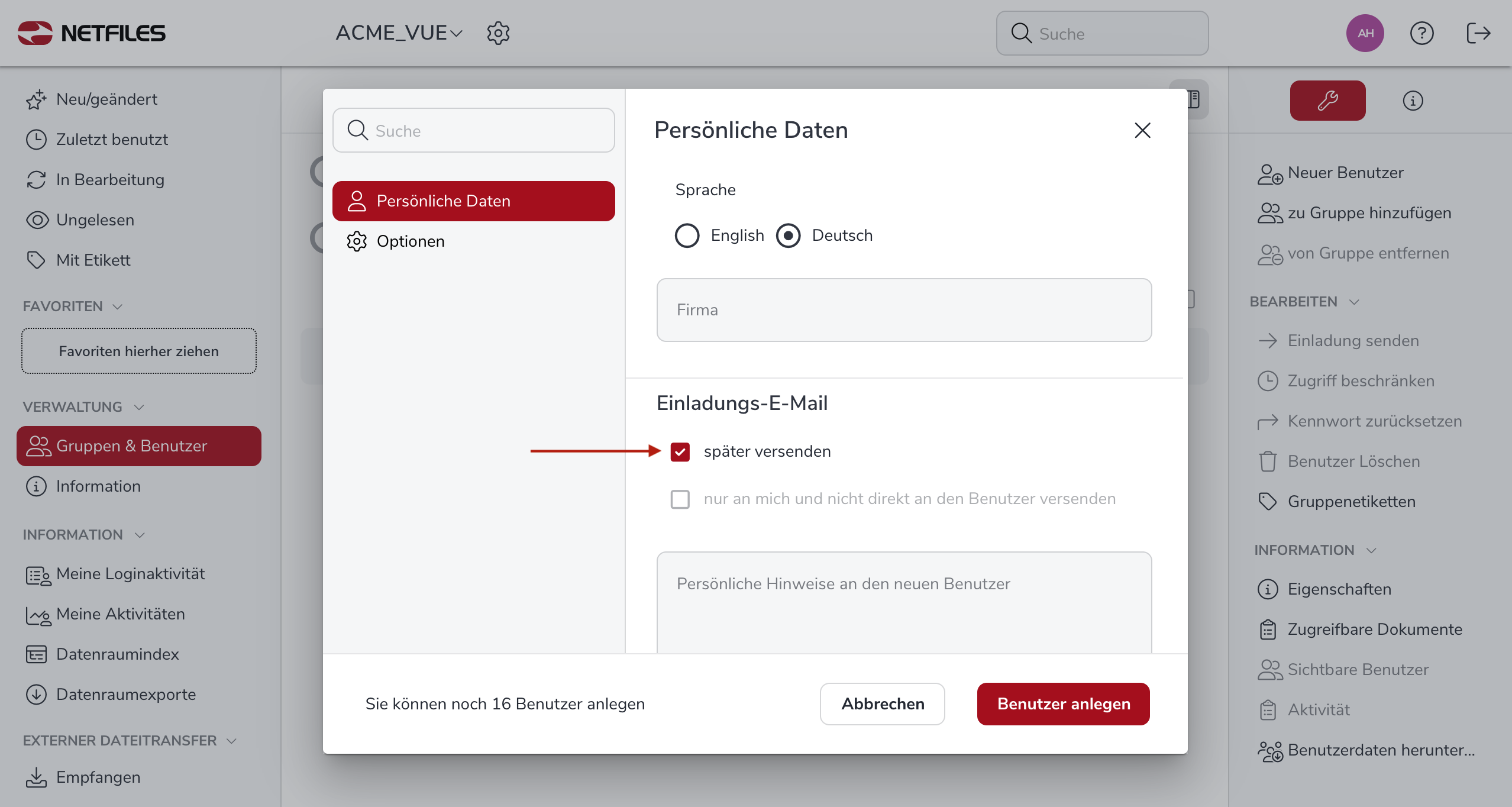 Sie können Benutzer in netfiles optional erst nur anlegen und zu einem späteren Zeitpunkt einladen, z.B. wenn der Datenraum komplett eingerichtet und alle Dokumente eingestellt worden sind.