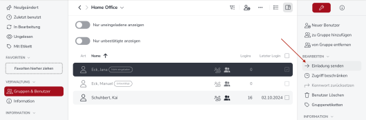Sie können diese Benutzer zu einem beliebigen späteren Zeitpunkt einladen, indem Sie diese Benutzer auswählen und in der rechten Funktionsleiste auf “Einladung versenden” klicken.