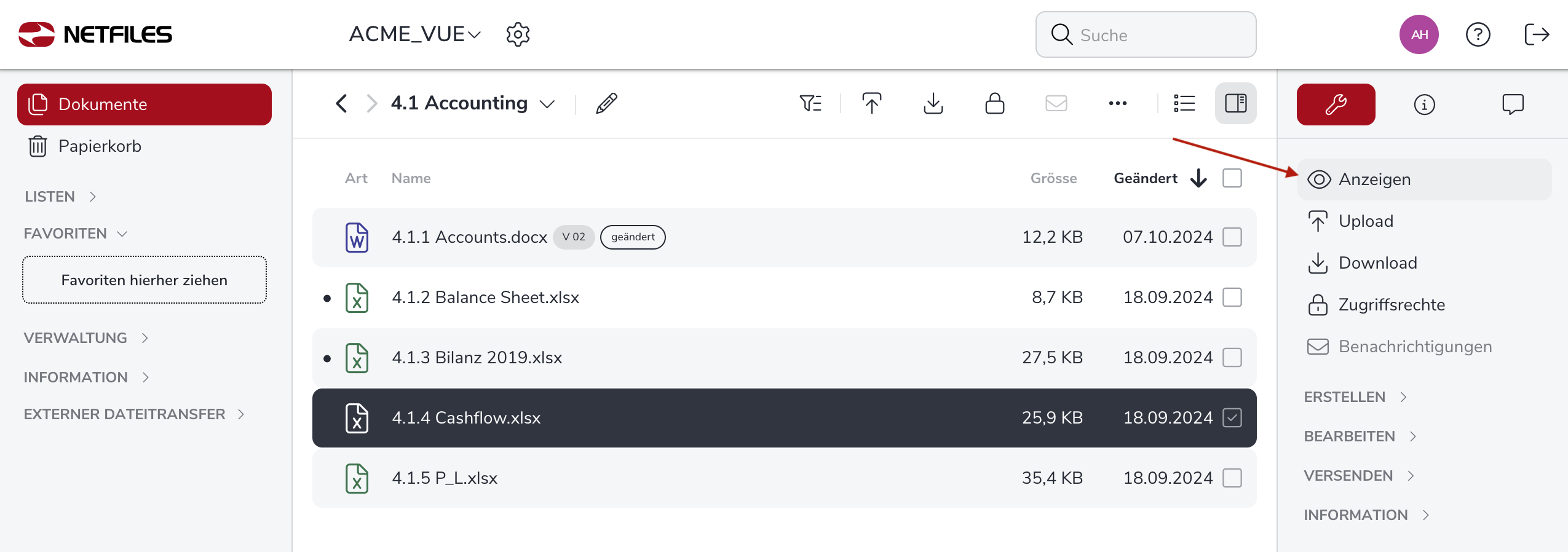 Ebenfalls können Sie nach Auswahl des gewünschten Dokuments die Funktion “Anzeigen” in der rechten Funktionsleiste für die Dokumentvorschau direkt im Webbrowser nutzen.