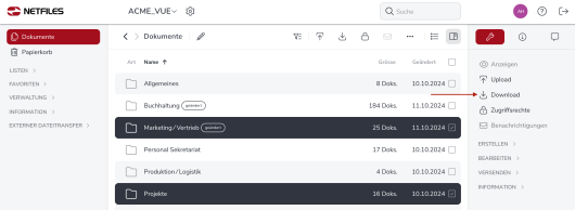 Um eine Datei oder einen kompletten Ordner mit Dateien auf Ihren Computer bzw. Ihren lokalen Datenträger herunterzuladen, wählen Sie eine oder mehrere Dateien bzw. Ordner aus und klicken dann auf “Download” in der rechten Funktionsleiste. Wenn Sie einen Ordner herunterladen, werden alle enthaltenen Dokumente und Unterordner, zu einer einzigen ZIP-Datei zusammengefasst und diese auf Ihren Rechner gespeichert. Sie finden die heruntergeladenen Dateien im Download Ordner, der in Ihrem Webbrowser eingestellt ist.