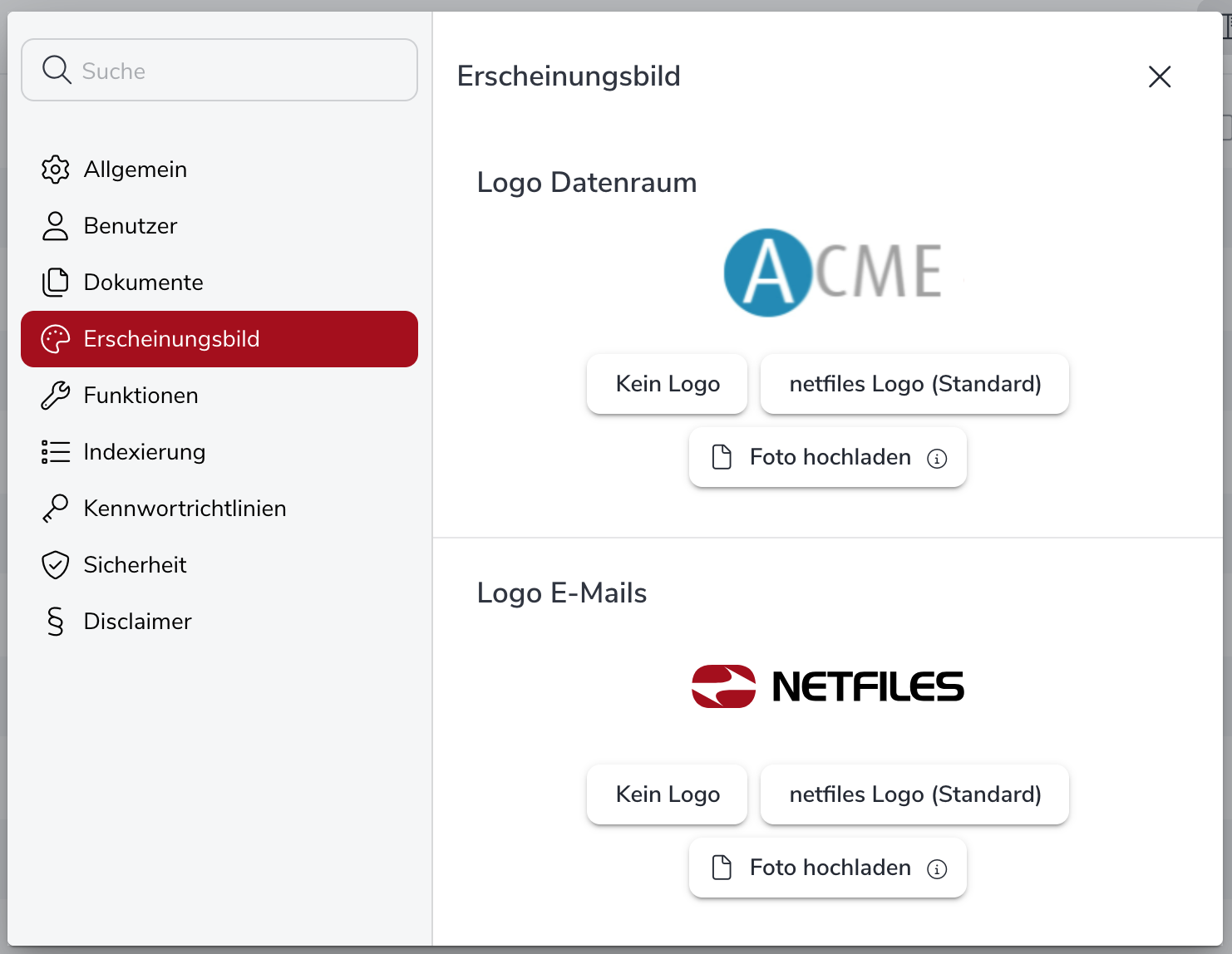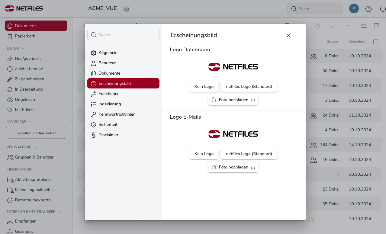 Als Administrator können Sie das Erscheinungsbild Ihres netfiles Datenraums anpassen und Ihr Firmenlogo einbinden.