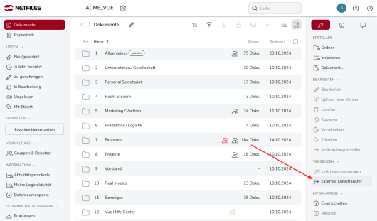 Mit der Funktion Externer Dateitransfer können Sie Dateien mit Personen ohne netfiles Benutzerkonto austauschen.