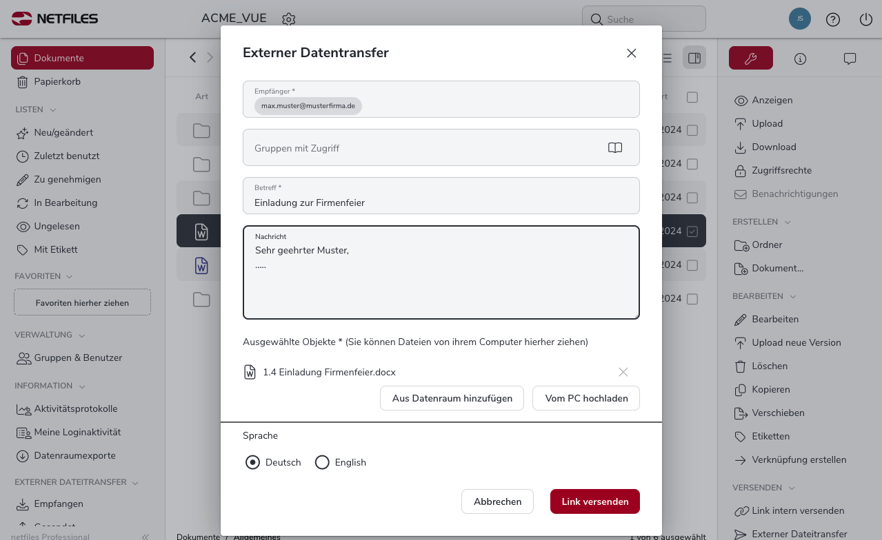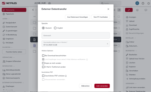 Markieren Sie die Datei und öffnen Sie den Dialog Externer Dateitransfer in der rechten Funktionsleiste. Geben Sie die E-Mail Adressen der Empfänger, eine Betreffzeile und optional eine Nachricht ein. Im Feld Dateien können Sie optional weitere Dateien aus dem Datenraum zum Link hinzufügen. Wenn die Option im Datenraum aktiv ist, können Sie auch Dateien direkt von Ihrem Rechner versenden.