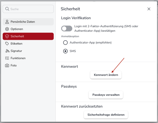 Sie können das Kennwort bzw. Passwort für Ihr netfiles Benutzerkonto ändern, in dem Sie auf Ihren Benutzernamen oben rechts und anschließend auf Sicherheit klicken.
