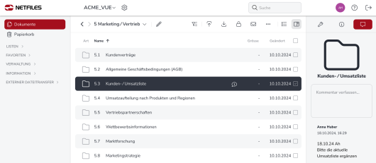 Abhängig von den Einstellungen und Berechtigungen im netfiles Datenraum können Benutzer Kommentare zu Ordnern und Dateien lesen und verfassen.