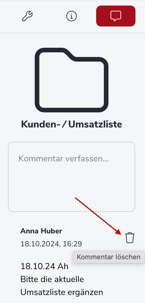 Benutzer können Ihre eigenen Nachrichten durch einen Klick auf das Papierkorb Symbol rechts neben dem Kommentar löschen. Administratoren können beliebige Kommentare löschen.