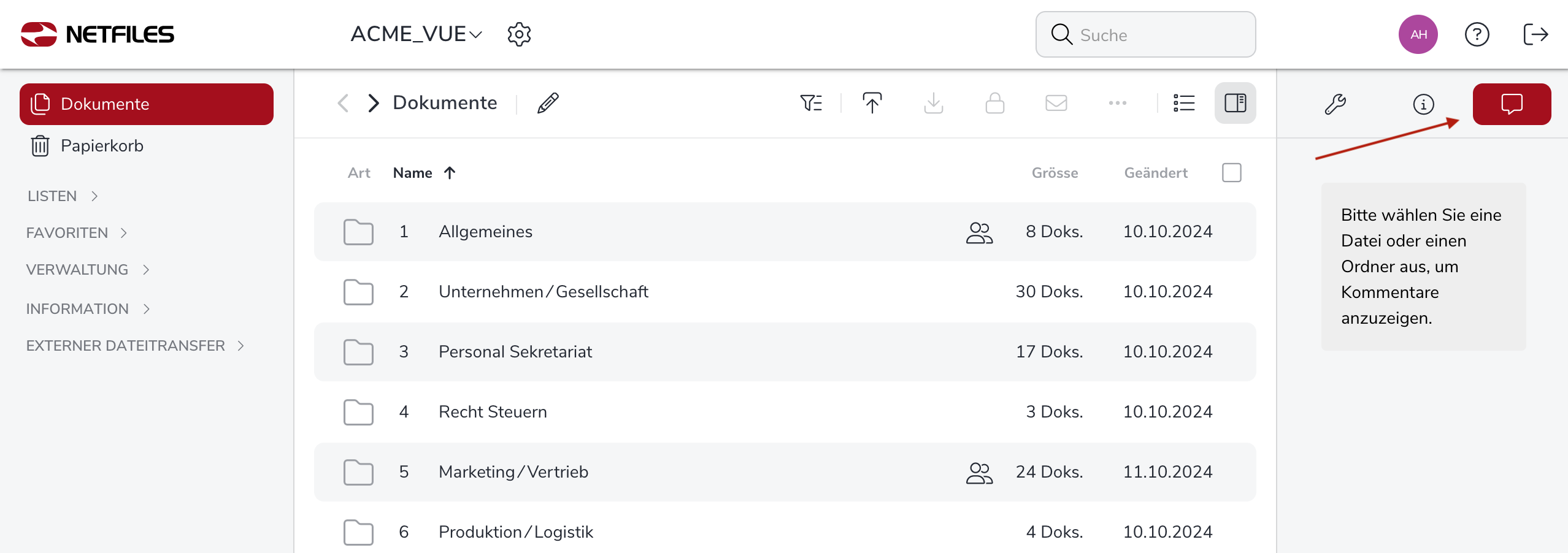 Abhängig von den Einstellungen und Berechtigungen im netfiles Datenraum können Benutzer Kommentare zu Ordnern und Dateien lesen und verfassen.