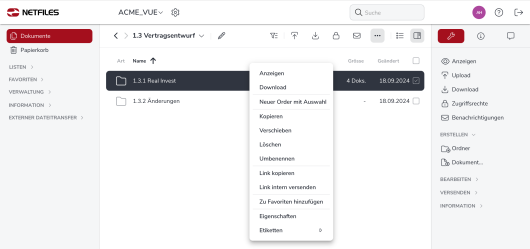 Über das Kontextmenü haben Sie direkten, schnellen Zugriff auf die wichtigsten Funktionen zur Bearbeitung und Organisation von Dateien in netfiles: