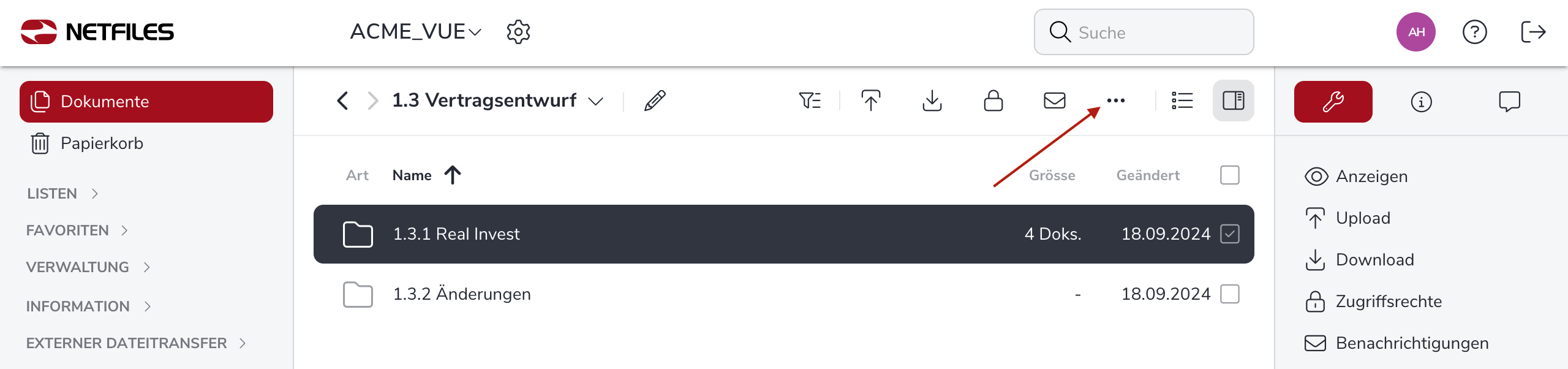 Alternativ erscheint das Kontextmenü auch, wenn Sie einen Ordner/Datei anklicken und oben auf das Icon mit den drei Punkten klicken.