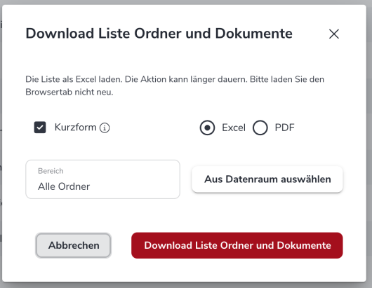 Wenn Sie nun auf „Aus Datenraum auswählen“ klicken, können Sie entsprechende Ordner auswählen. Wenn Sie hingegen „Download Liste Ordner und Dokumente“ wählen, dann wird ein Excel/PDF Dokument generiert.