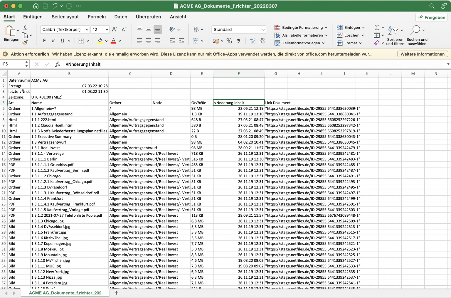 Wenn Sie eine Liste mit allen Ordnern und Dokumenten (Index) aller Ihrer verfügbaren Dokumente brauchen, können Sie diese als Excel-Dokument herunterladen.