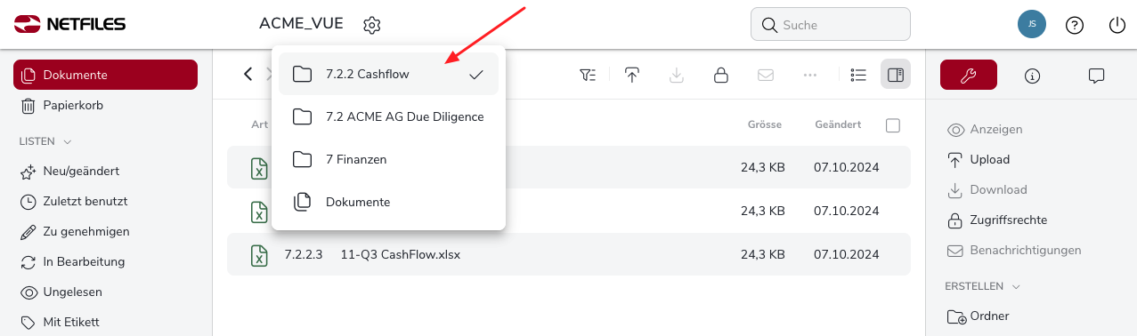 Durch Klicken auf den kleinen Pfeil neben dem Ordnernamen öffnet sich der Navigationspfad mit dem Sie schnell innerhalb Ihres Datenraumes navigieren können.