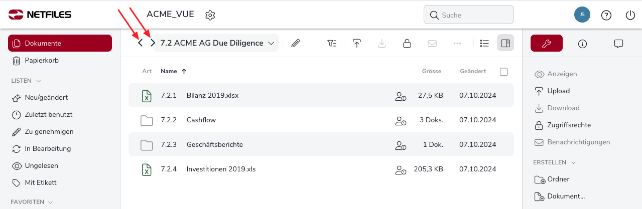 Für die “Zurück-Navigation” bzw. um zu einer vorherigen Seite in netfiles zu gelangen, verwenden Sie bitte den Pfeil in der oberen Navigationsleiste und nicht den “Zurück-Button” Ihres Webbrowsers.