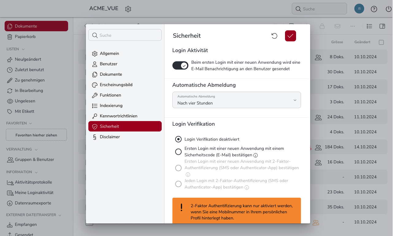 In diesen Einstellungen können Sie erweiterte Sicherheitsfunktionen, wie z.B. die 2-Faktor-Authentifizierung (Login Verifikation 2FA) oder personalisierte Wasserzeichen (nur netfiles Professional und netfiles Deal Room) für Ihren Datenraum aktivieren.