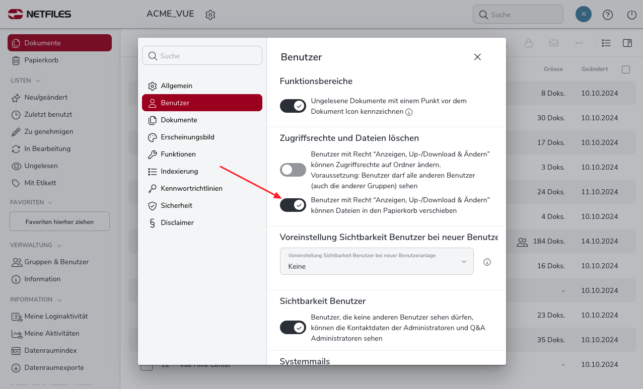 Die Funktion “Papierkorb” kann vom Administrator in den „Datenraum Einstellungen“ über das Zahnrad-Symbol neben Ihrem Datenraumnamen im Bereich „Benutzer” und „Zugriffsrechte und Dateien löschen“ ein- und ausgeschaltet werden. Ist die Option “Dateien löschen” deaktiviert, können nur Administratoren den Papierkorb sehen und Dateien löschen, d.h. in den Papierkorb verschieben.