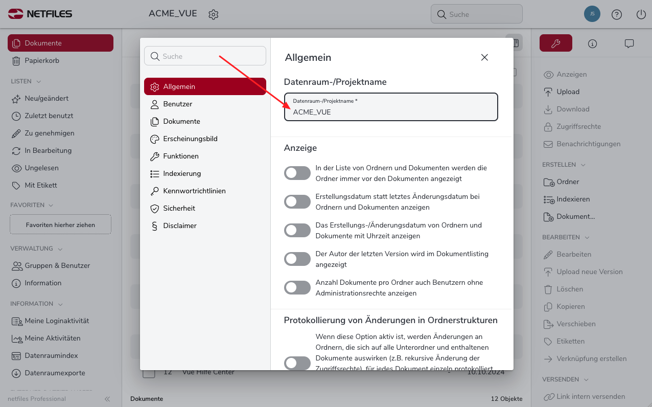 - Wie kann ich den Datenraumname / Projektname ändern? (Admin)