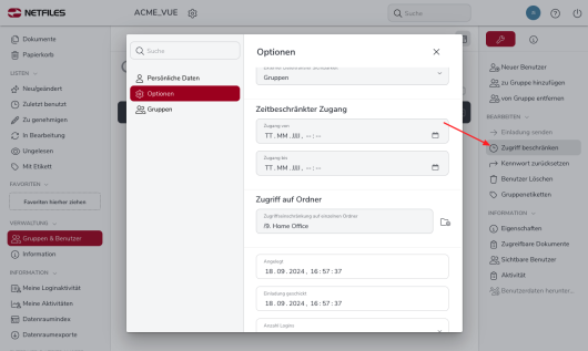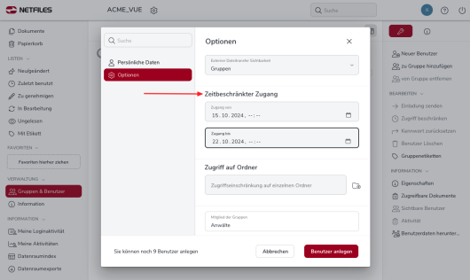 Wie kann man einen Benutzerzugang bzw. Datenraumzugang zeitlich einschränken? (Admin)