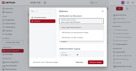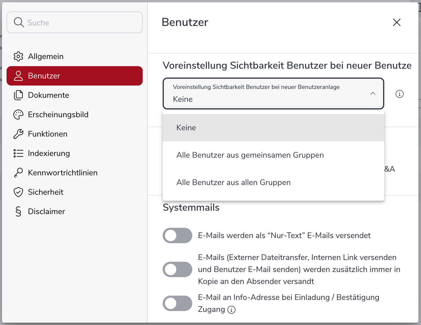 Beim Anlegen von Benutzern können Administratoren und Gruppenadministratoren festlegen, ob und welche anderen Benutzer ein Benutzer sehen darf.